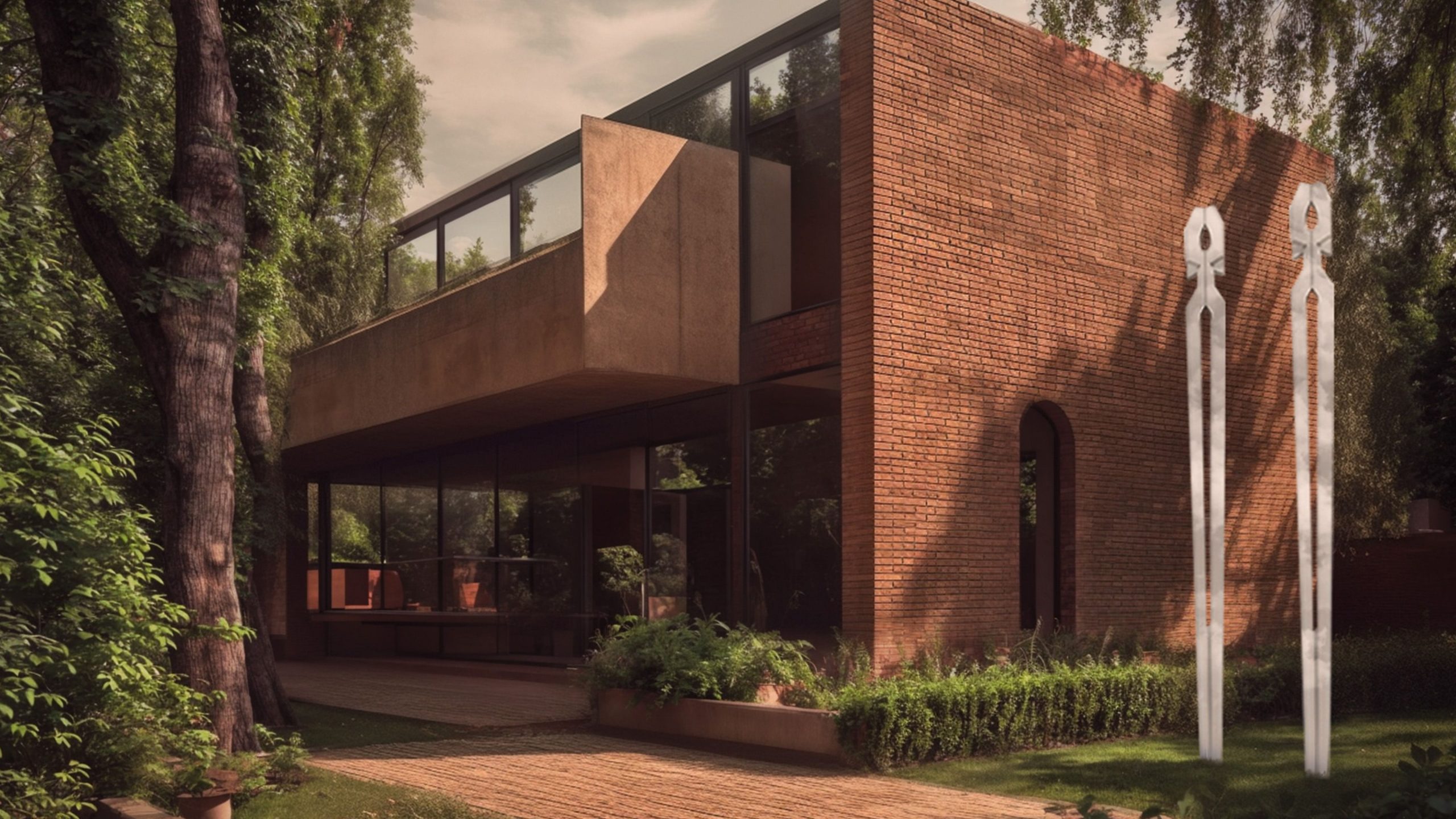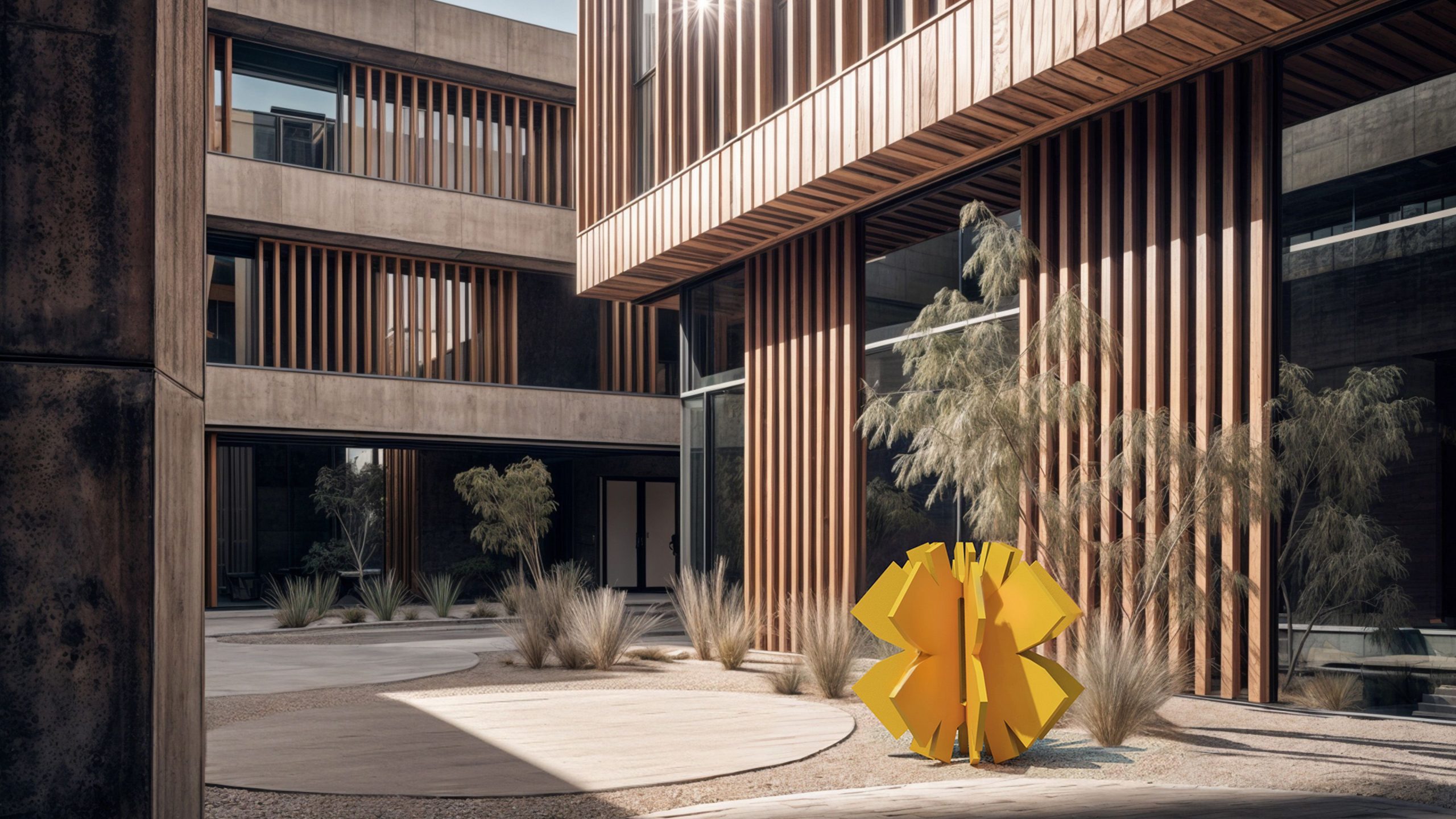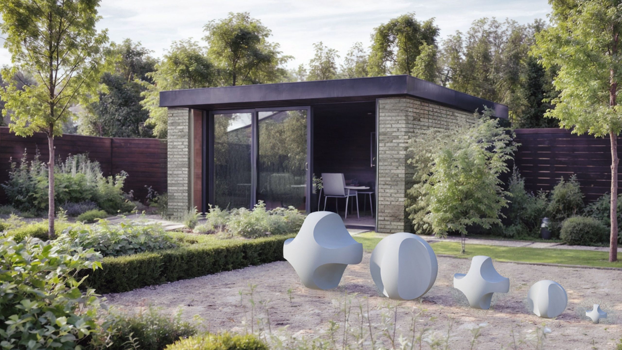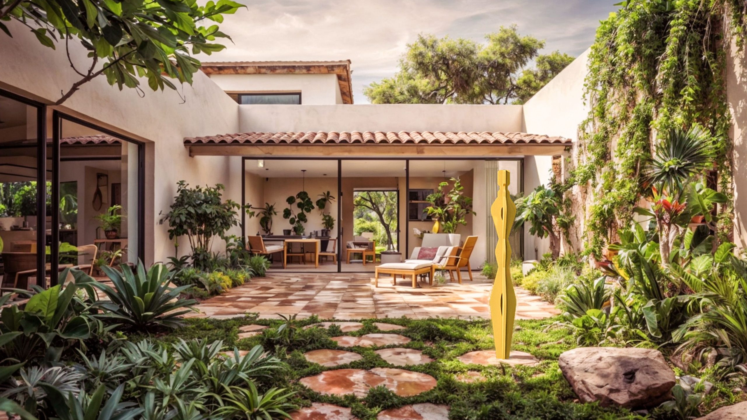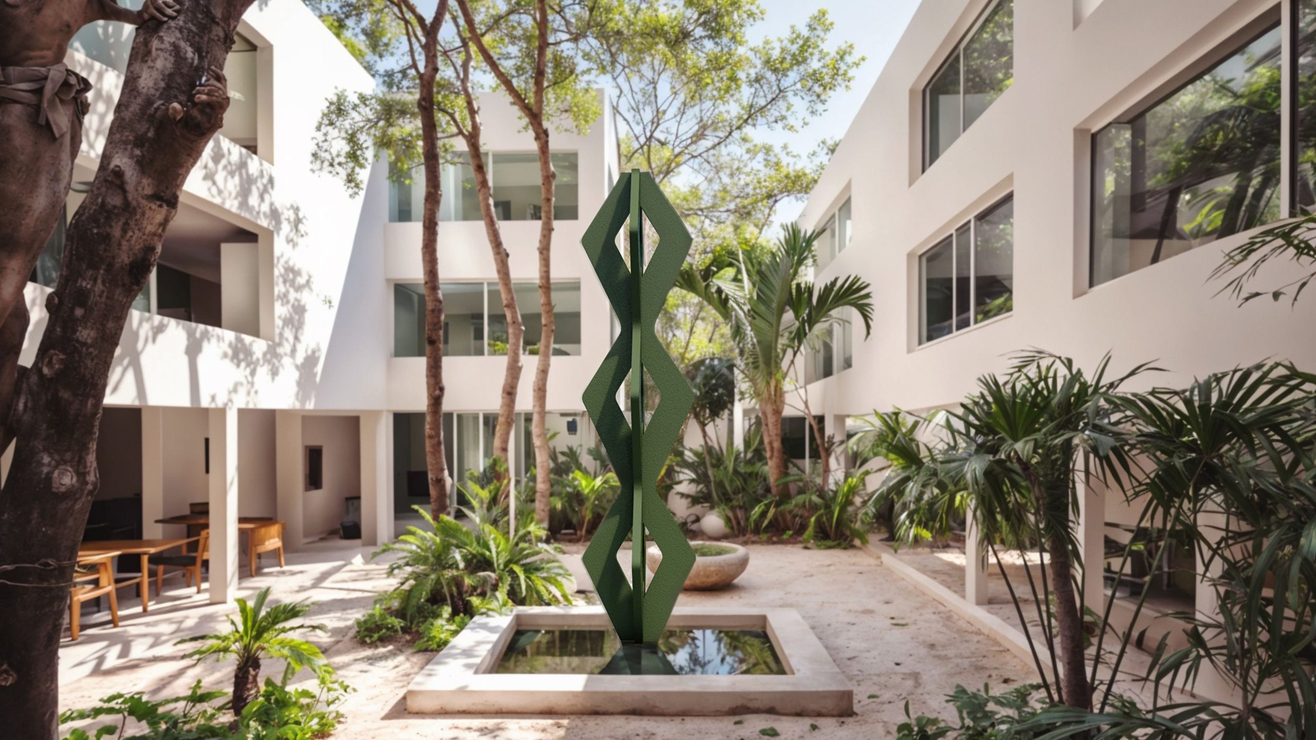 El amplio patio ajardinado, adornado con una escultura, crea un entorno propicio para la inspiración y la concentración, reflejando nuestro compromiso con el diseño que mejora la calidad de vida.