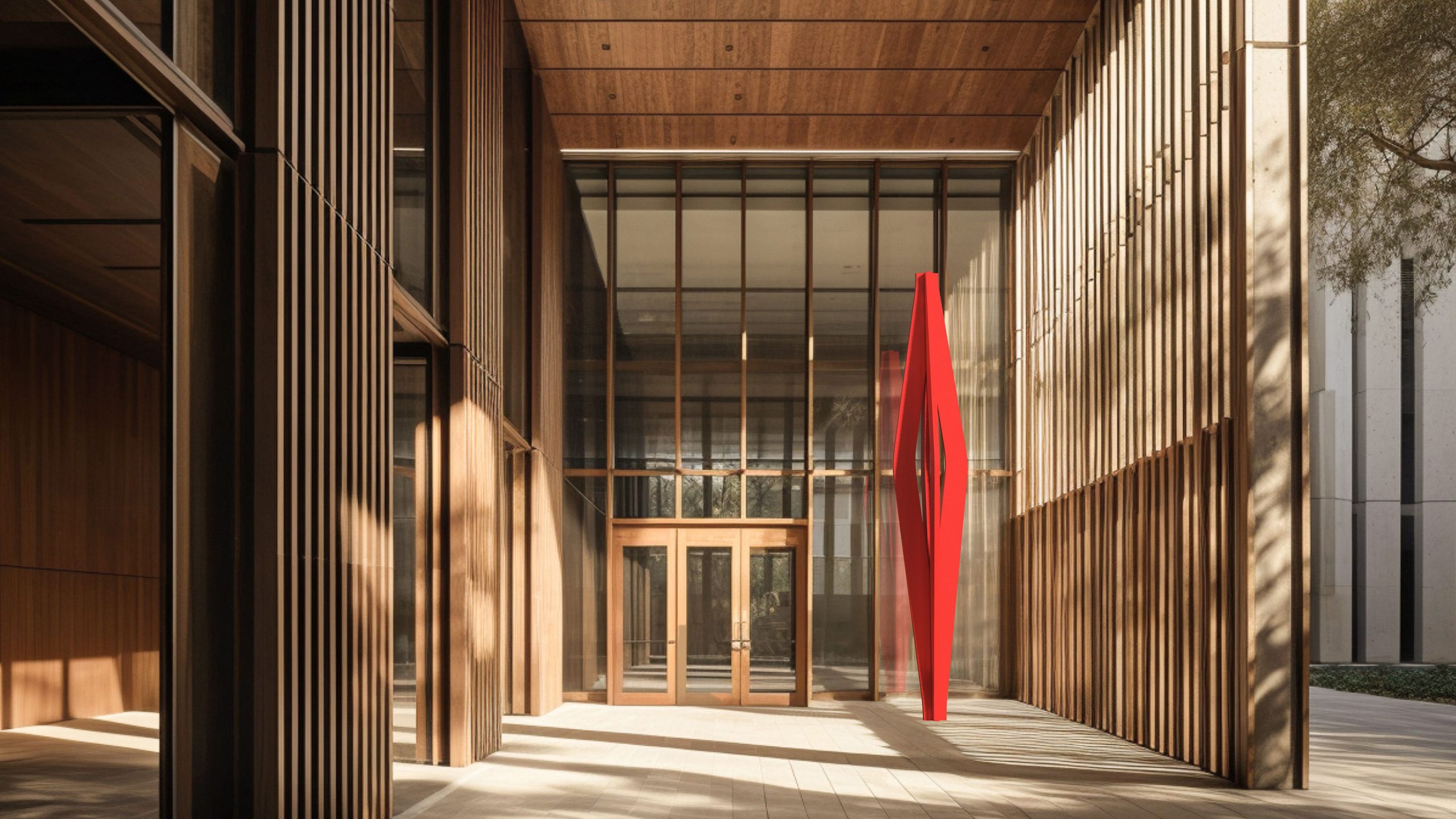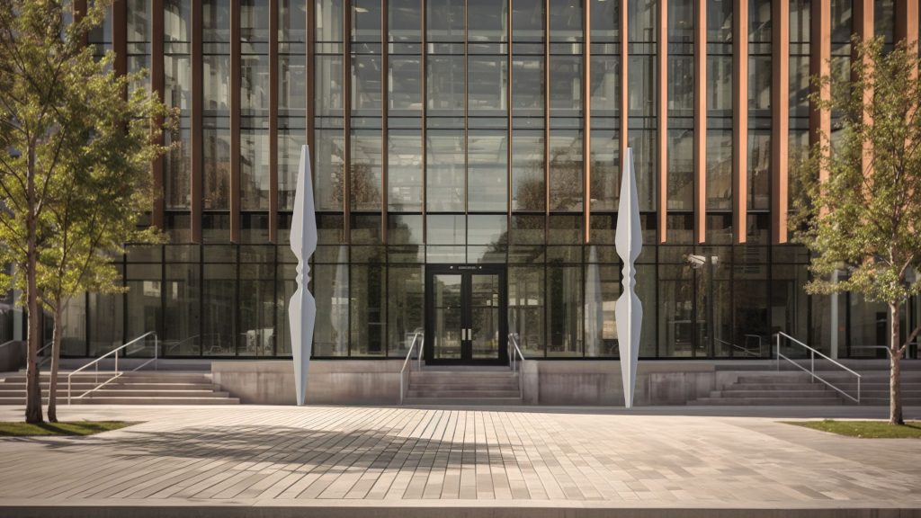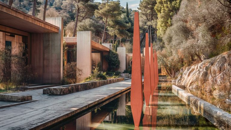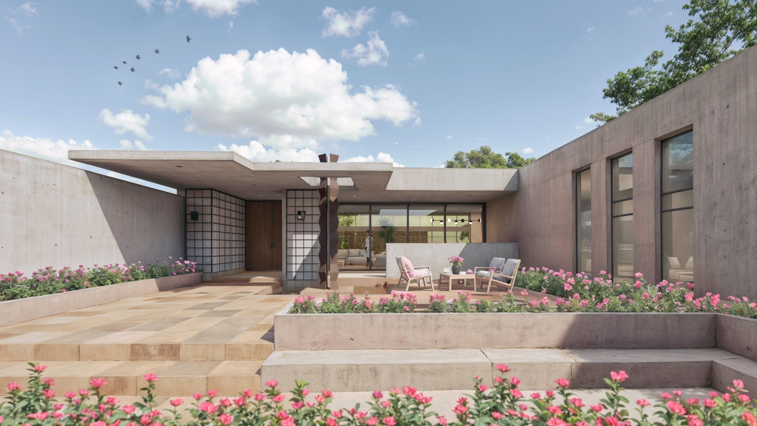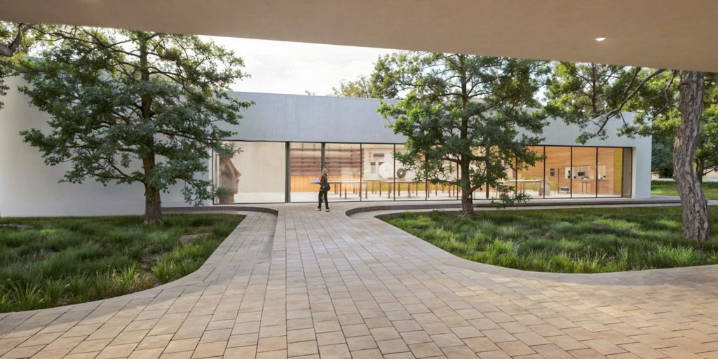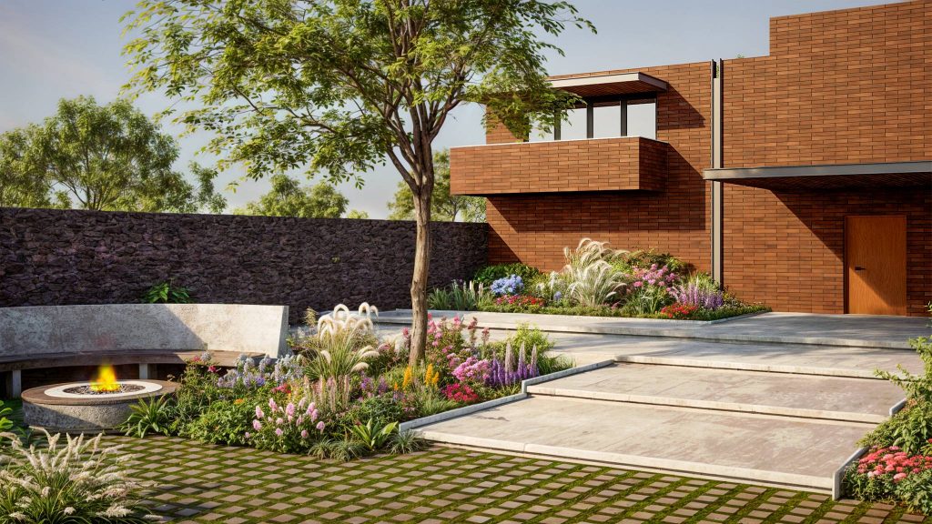 El amplio patio ajardinado, adornado con una escultura, crea un entorno propicio para la inspiración y la concentración, reflejando nuestro compromiso con el diseño que mejora la calidad de vida.