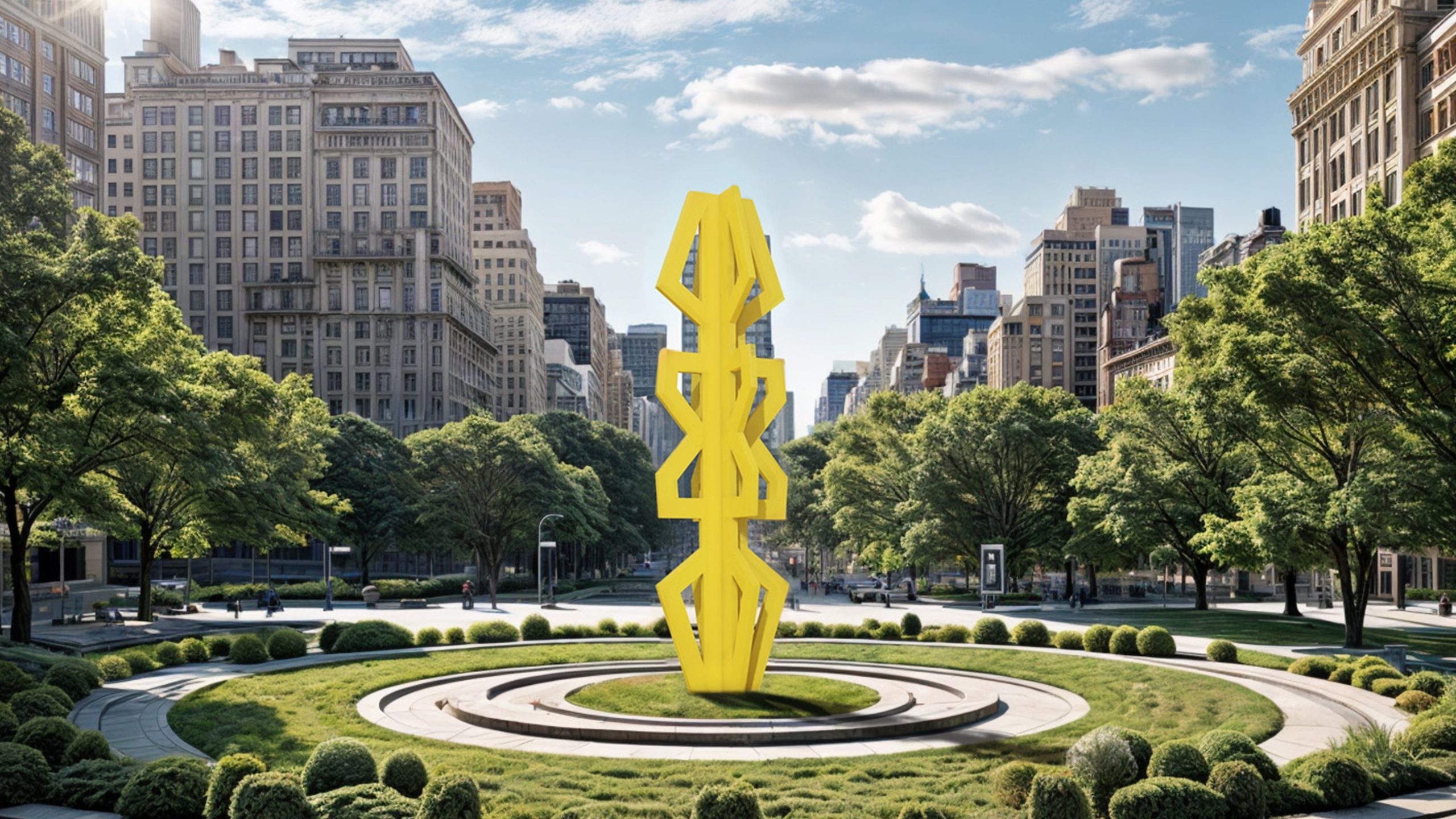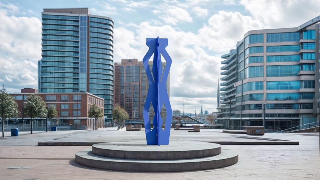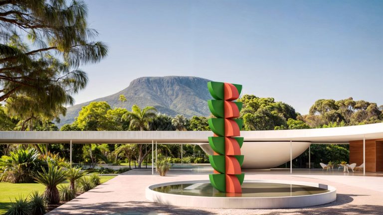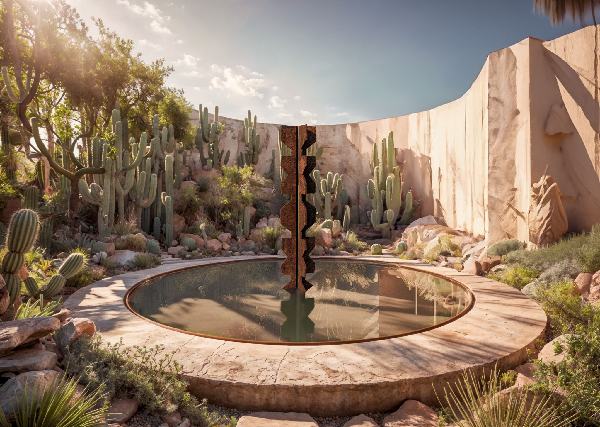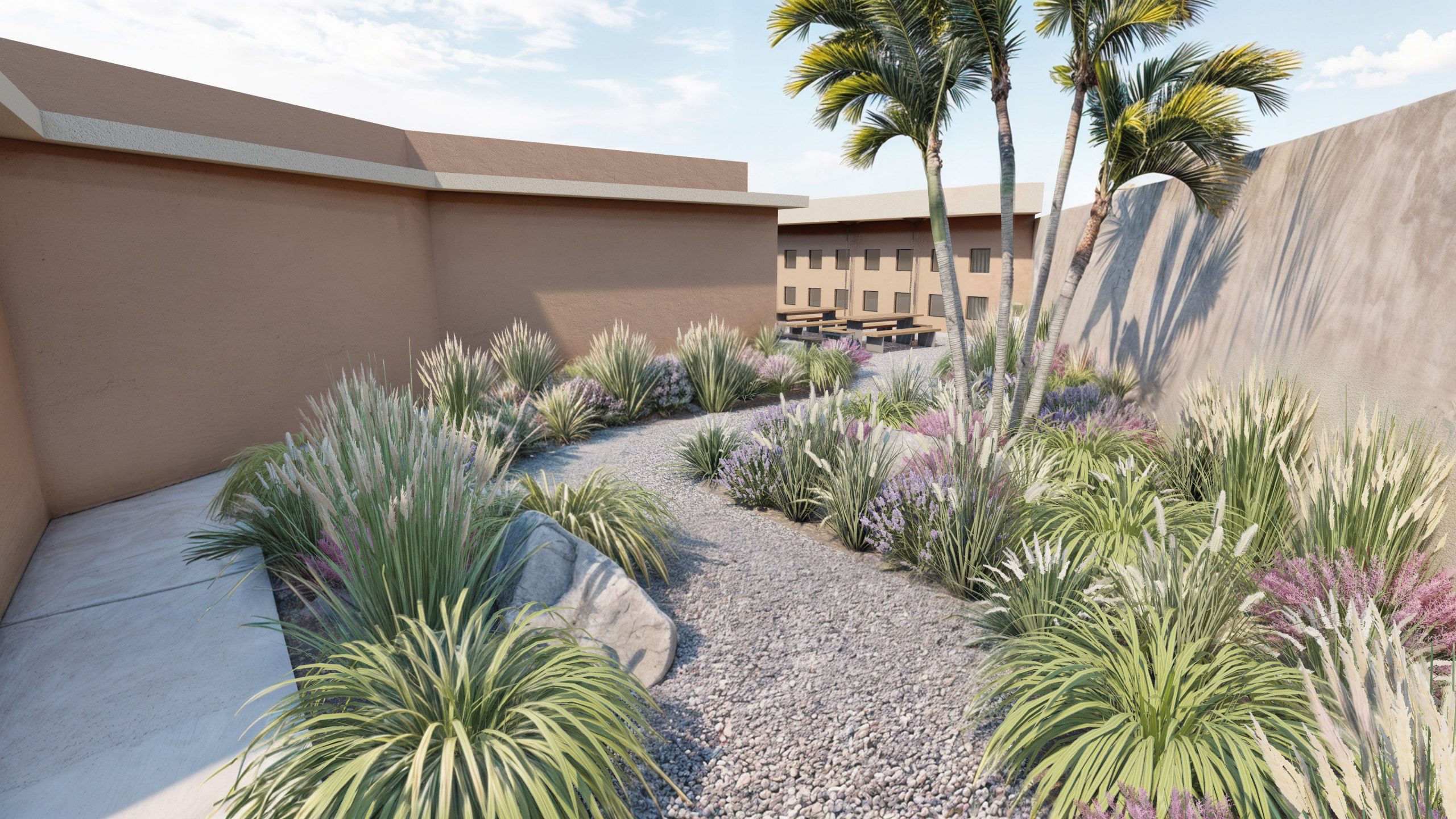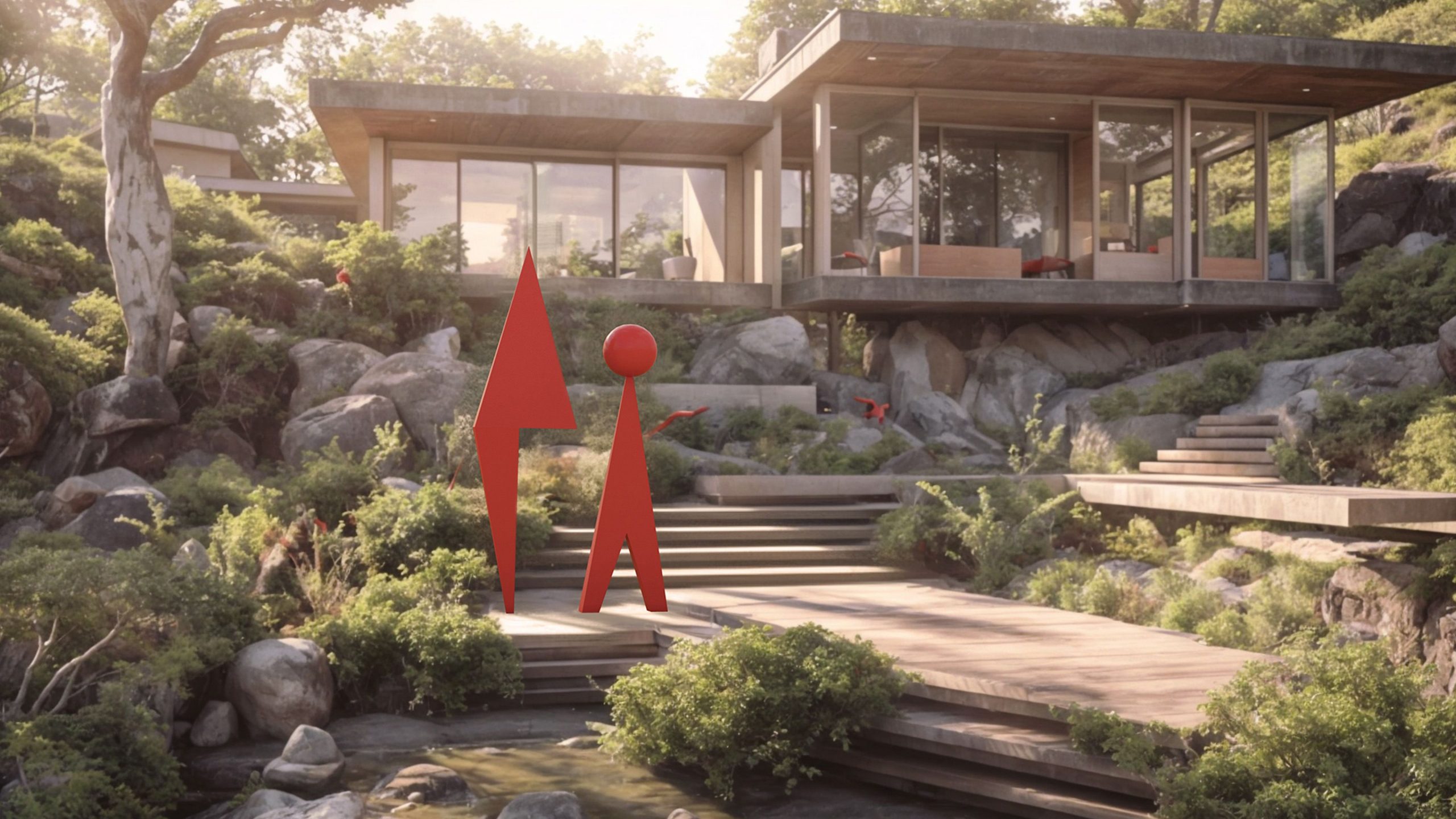 El amplio patio ajardinado, adornado con una escultura, crea un entorno propicio para la inspiración y la concentración, reflejando nuestro compromiso con el diseño que mejora la calidad de vida.